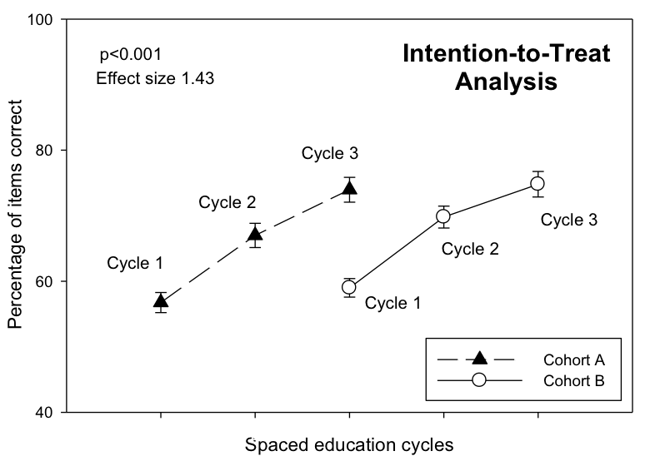 In this randomized trial conducted in the early years of spaced education’s development, 36 questions and explanations on "how to perform the physical exam" were emailed over 6 weeks to 120 students in their second year at Harvard Medical School. This was all new material to the students – they had not learned about the physical exam before this. After the initial presentation of the material, it was re-presented to them twice more over the following 12 weeks. Under an intent-to-treat analysis, the spaced education program caused students’ baseline scores to increase from a mean 57.9% (SD 10.7) in cycle 1 to 74.4% (SD 13.9) in cycle 3 (P<.001), representing a 28.6% relative score increase and a Cohen’s effect size of 1.54.