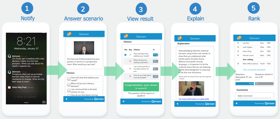 Popular sales training programs that promote microlearning include Sandler Training and Richardson’s Connected Selling Program — both of which are Qstream partners. Richardson, for example, integrates the Richardson QuickCheck™ program with Qstream’s best-practice microlearning solution to reinforce key concepts in 3-5 minutes per day, 2-3 times a week for 12 weeks. Participants are notified via email or a notification on their mobile device that a lesson is available, which contains a short selling multiple-choice scenario. As soon as the person selects an answer, they get immediate feedback.